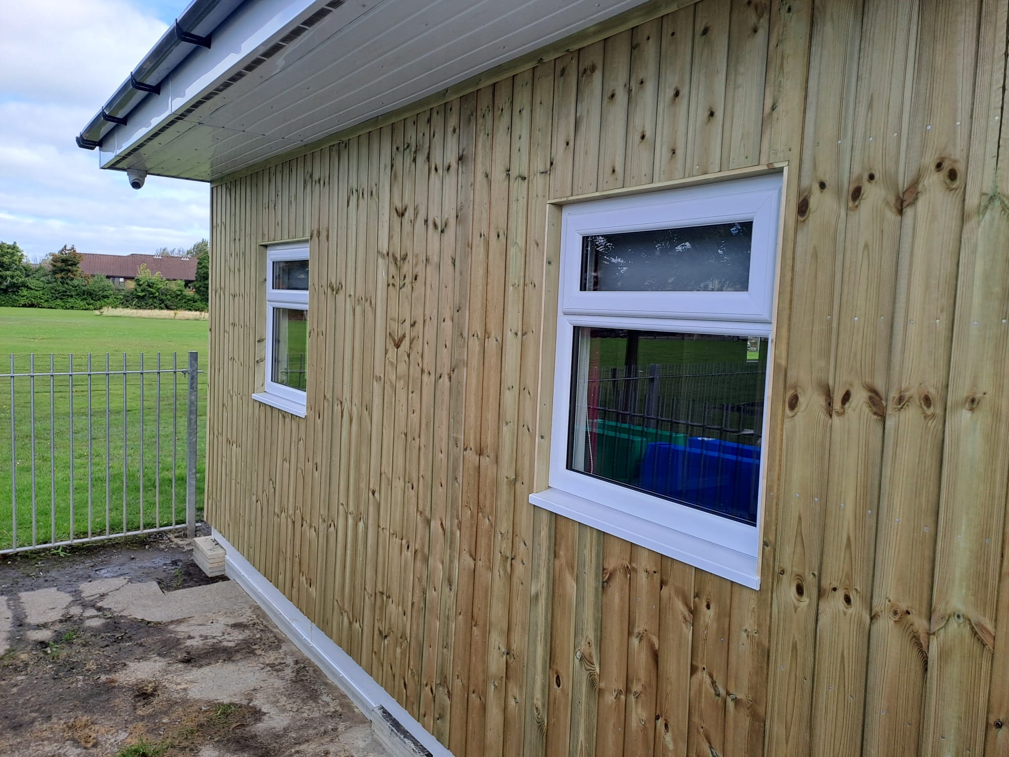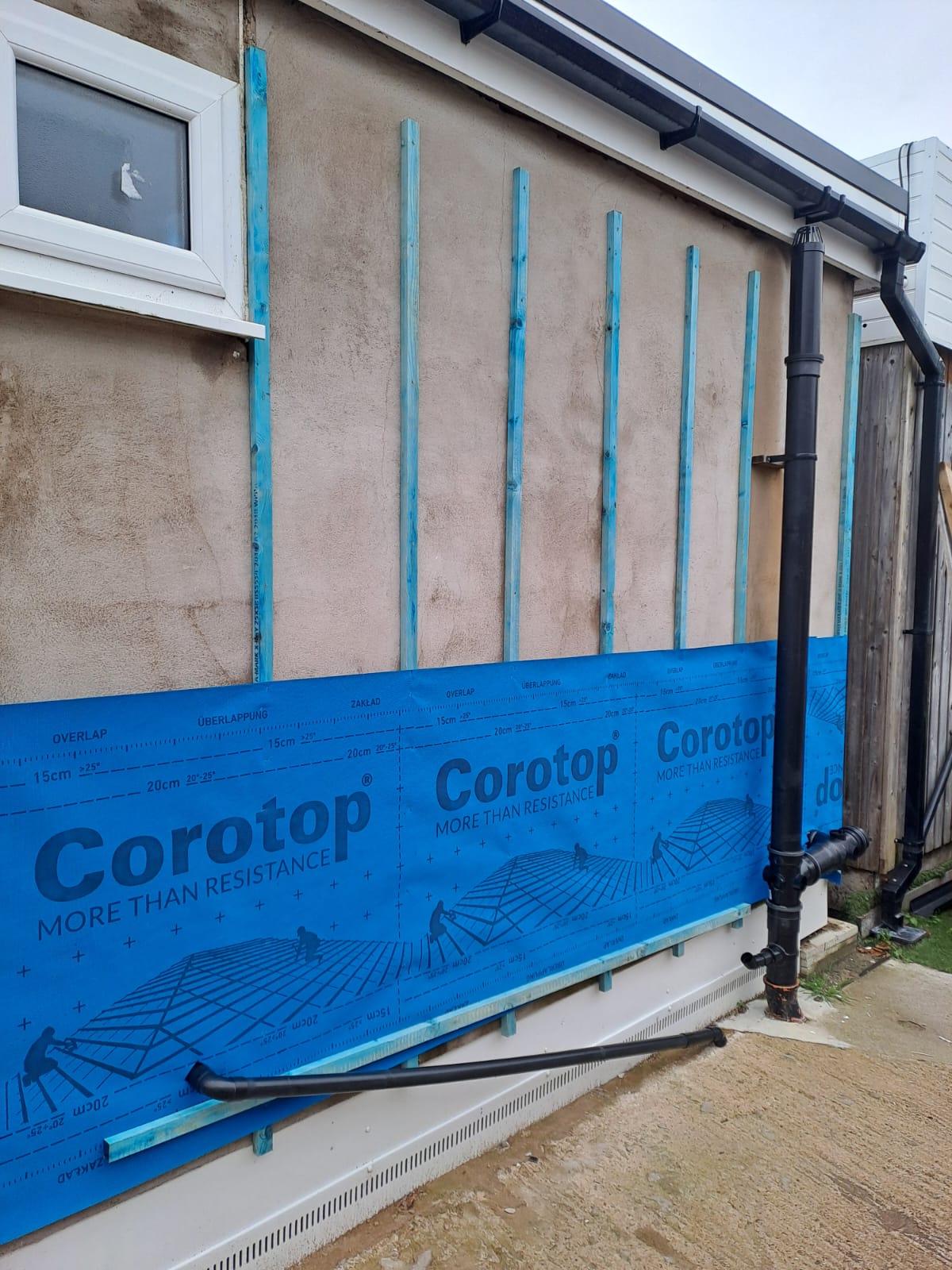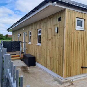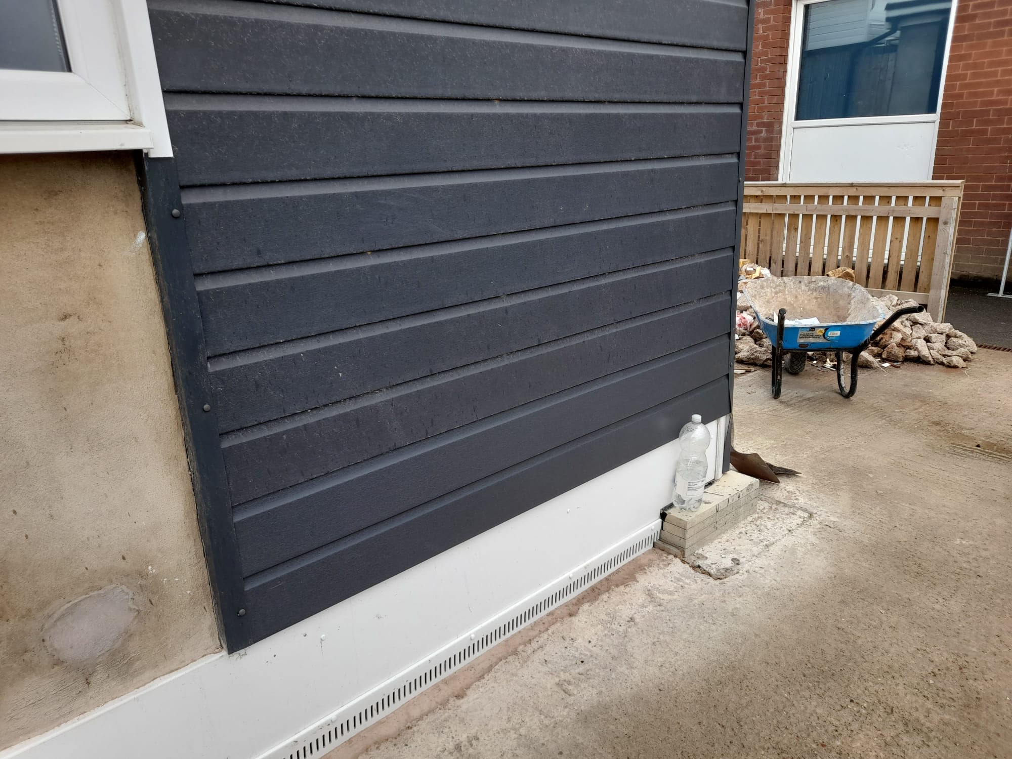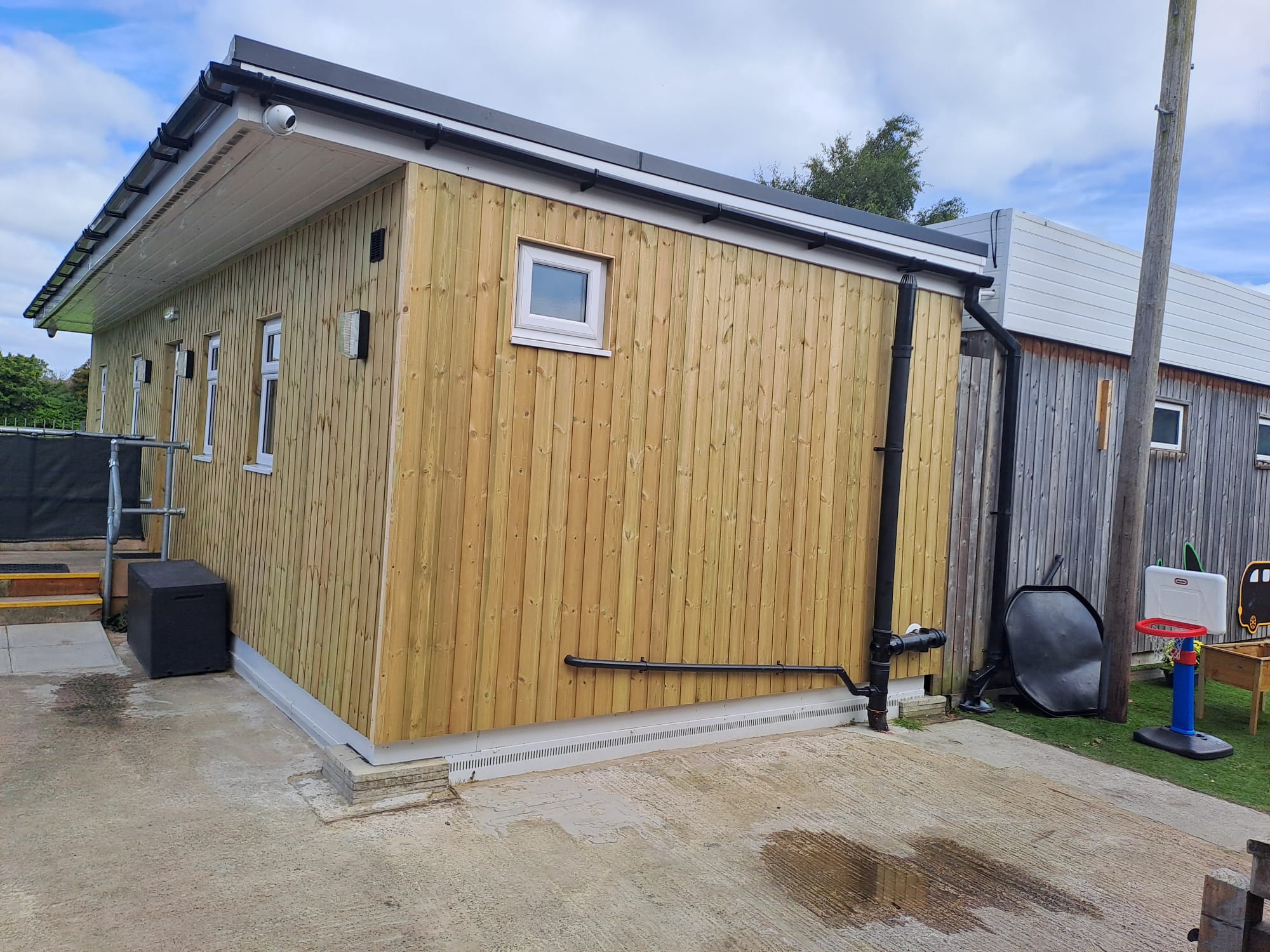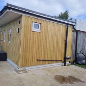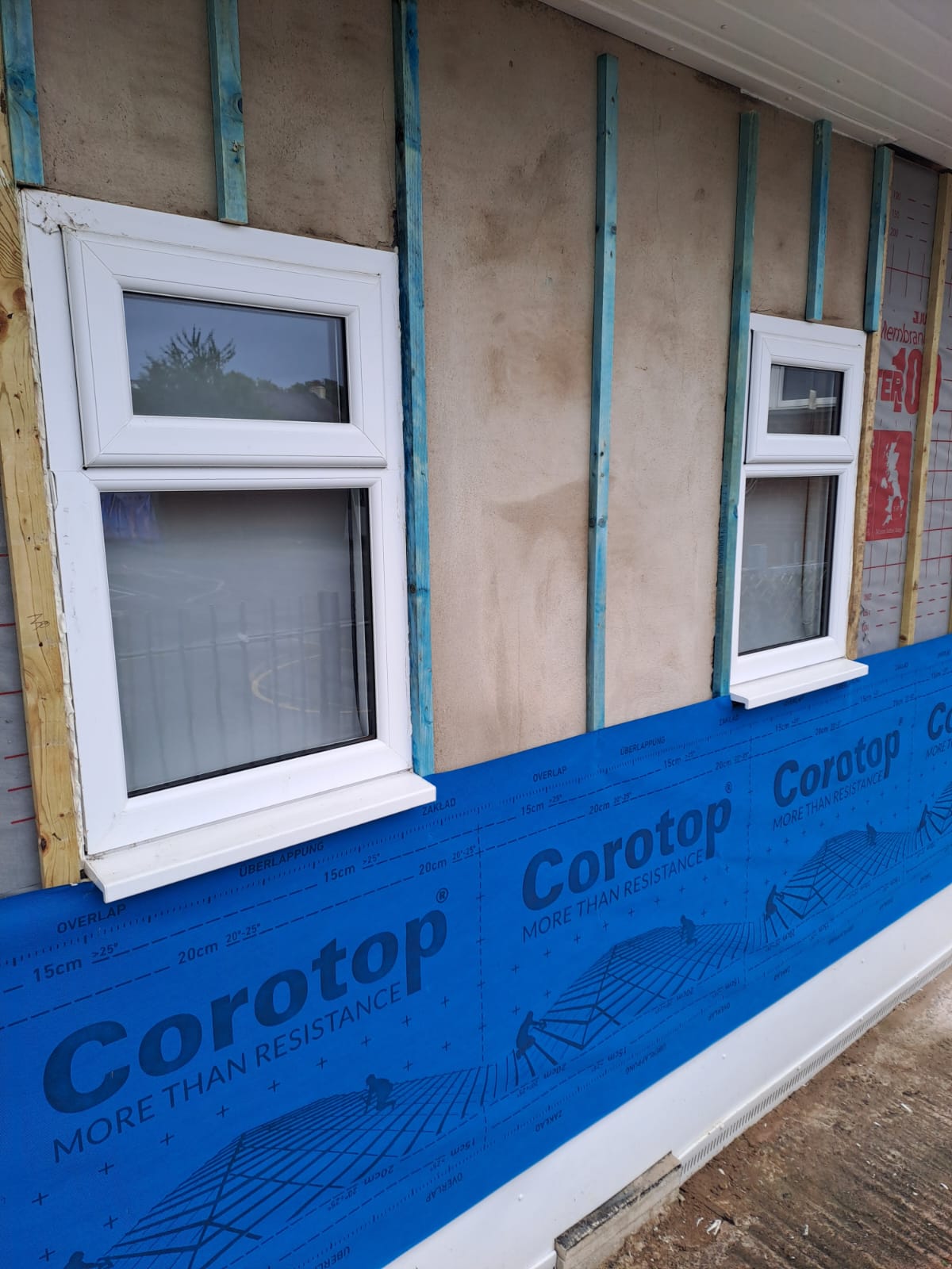 The Upvc Cladding & Render was Not in the approved planning plans when the Building was built. We had to remove all the cladding, extend all the services. This enabled the building to be counter Battened with a Breathable Membrane. To complete the External finish as per the approved Plans, the walls were clad with vertically boarded shiplap treated boards.