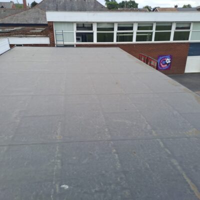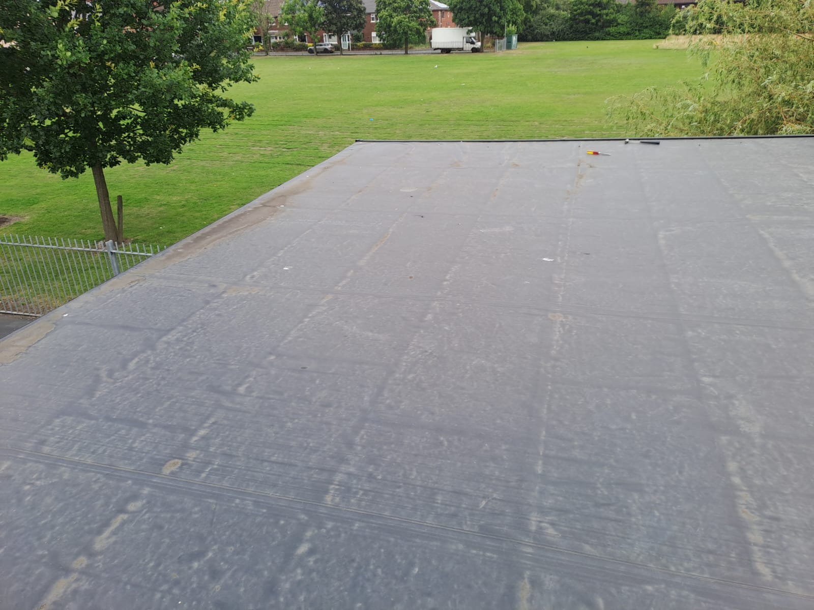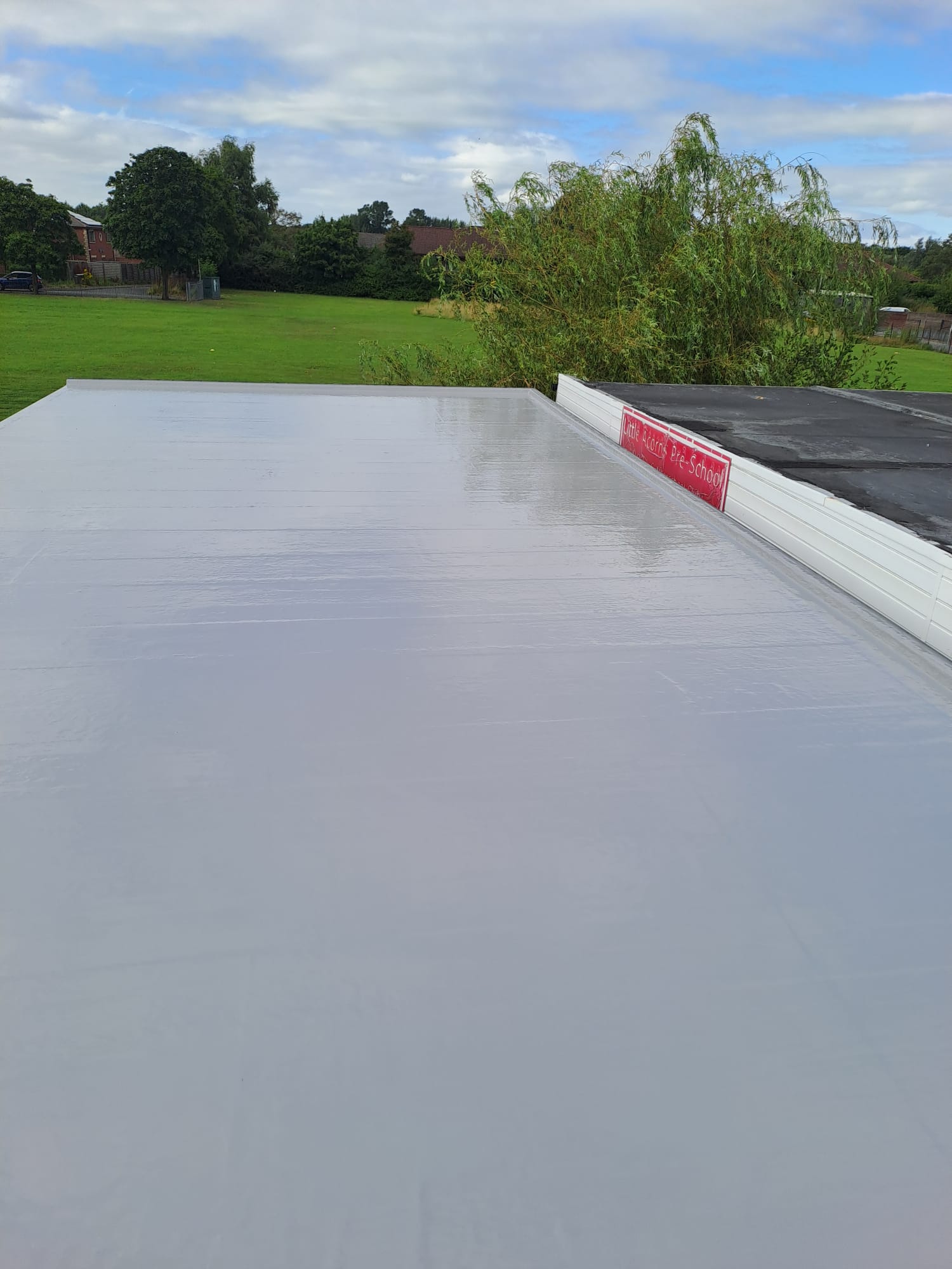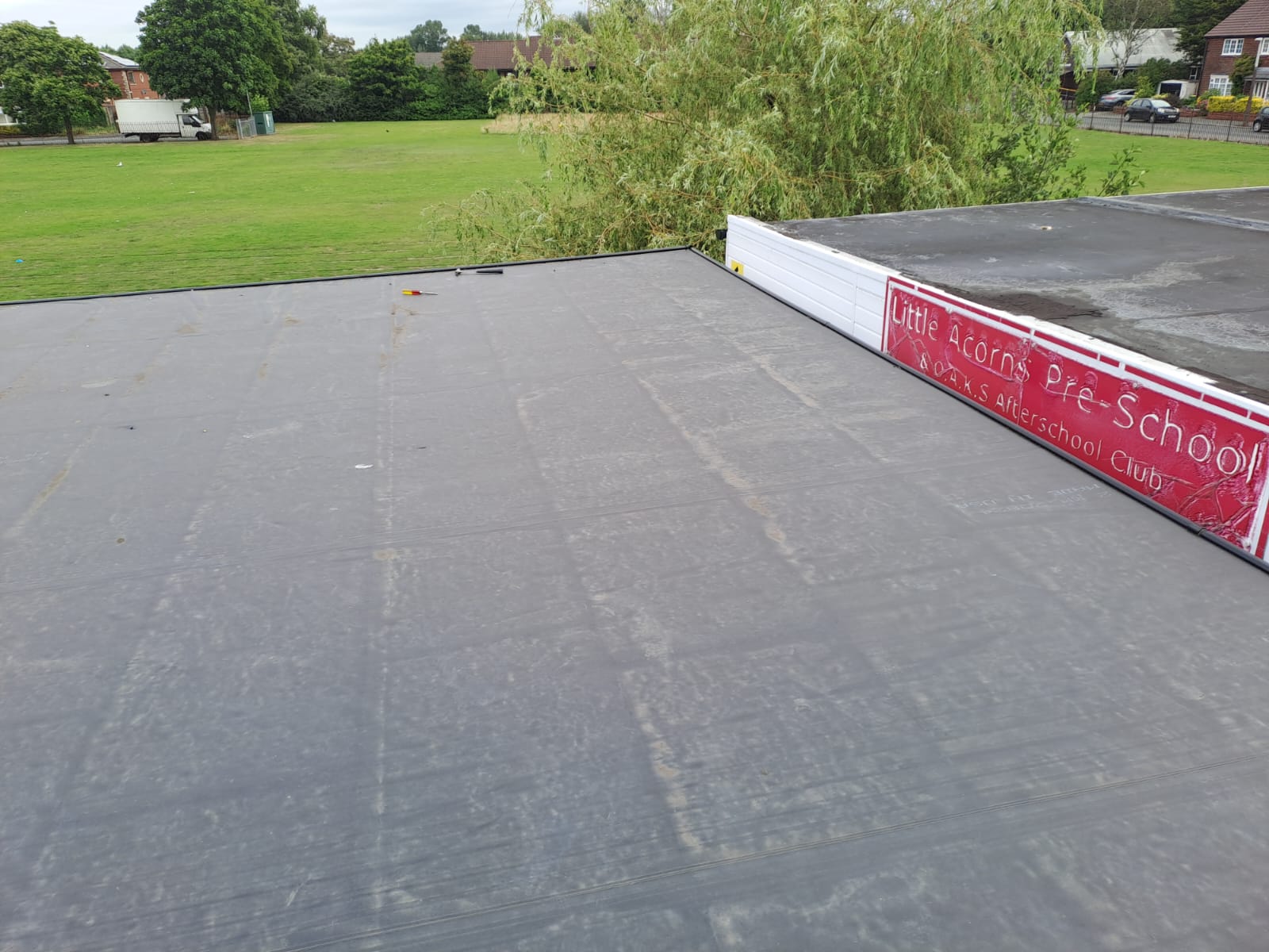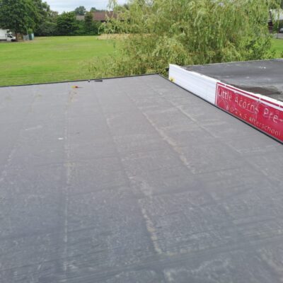 The Roof on this Nursery, was covered with EPDM Rubber that was not fully Bonded to the Timber Substrate & was identified by local Authority Building Control as an issue that needed addressing. The Roof coverings & Deck was replaced with New Plywood & Re covered with a Glass reinforced Matting, embedded on 2 Coats of solvent Free Polyurethane liquids.