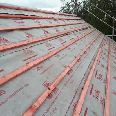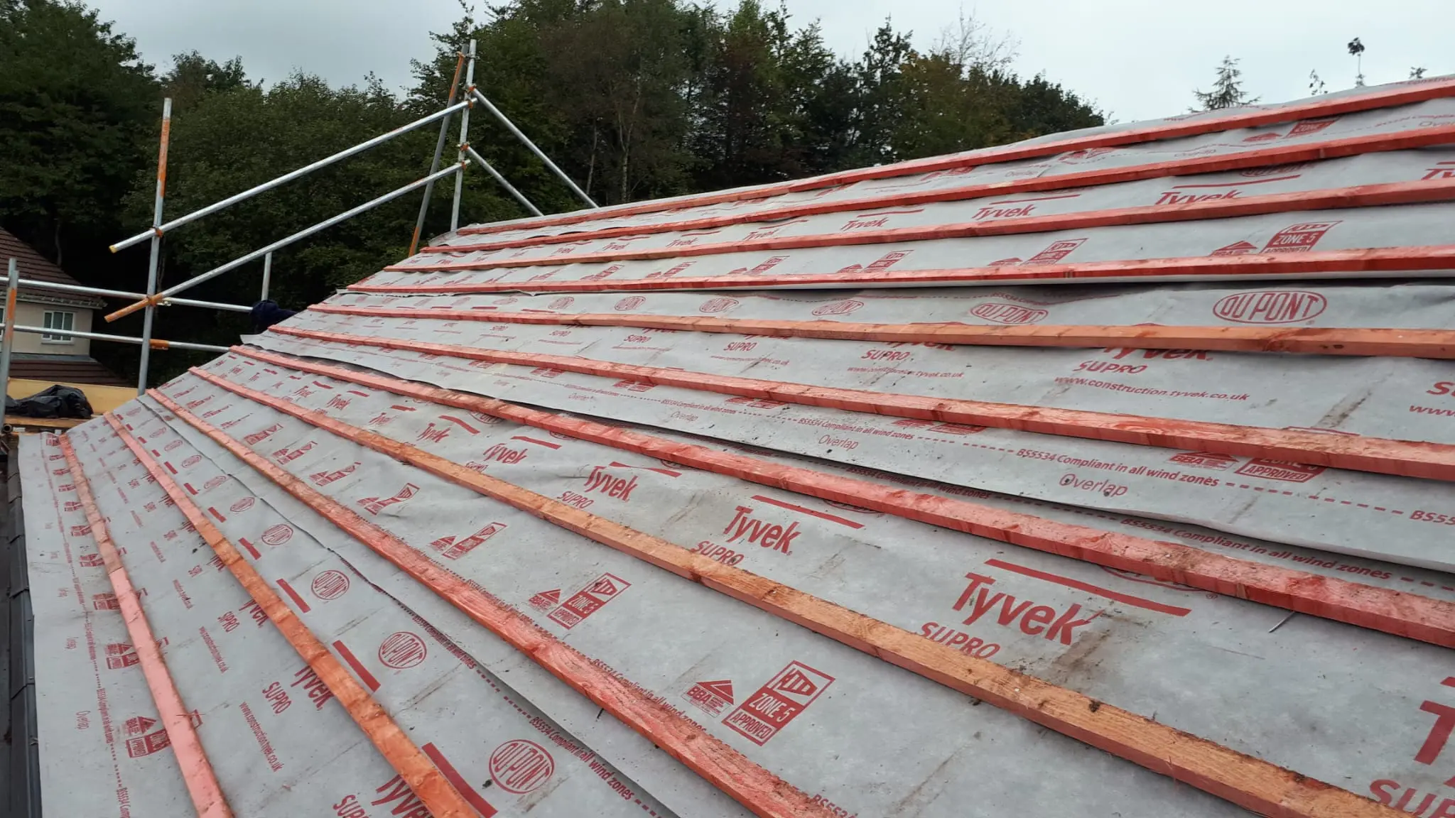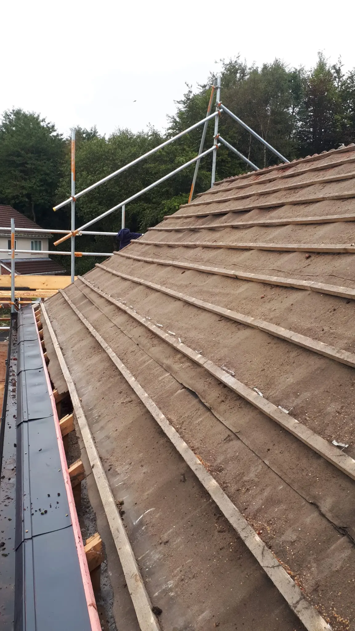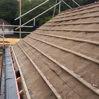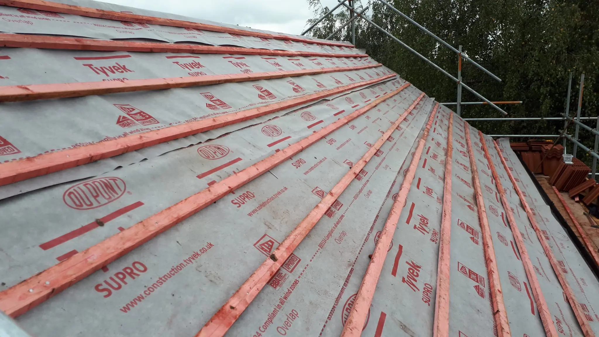 The existing roof coverings, including all Roof Tiles, Bitumen Felt, and Timber Battens, were fully removed. The roof was then replaced with new materials, including a breathable roofing felt, structural graded timber battens, a felt support eaves tray, a new lead valley, and a dry-fit ridge kit.